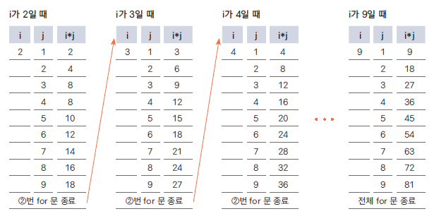 # 따라서 i가 2일 때 2*1, 2*2, 2*3 ~ 2*9까지 차례대로 수행되며 그 값을 출력하게 된다.