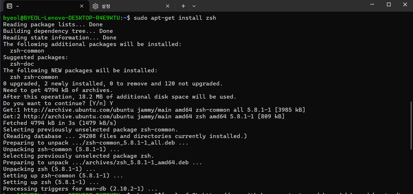 2. 다음으로 zsh 입력 명령어를 쳐준다.