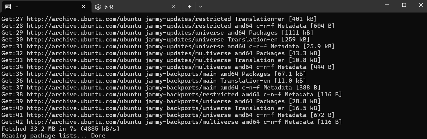 1. 윈도우 터미널에서 ubuntu를 실행한 후 우선 아래 명령어를 입력해준다.