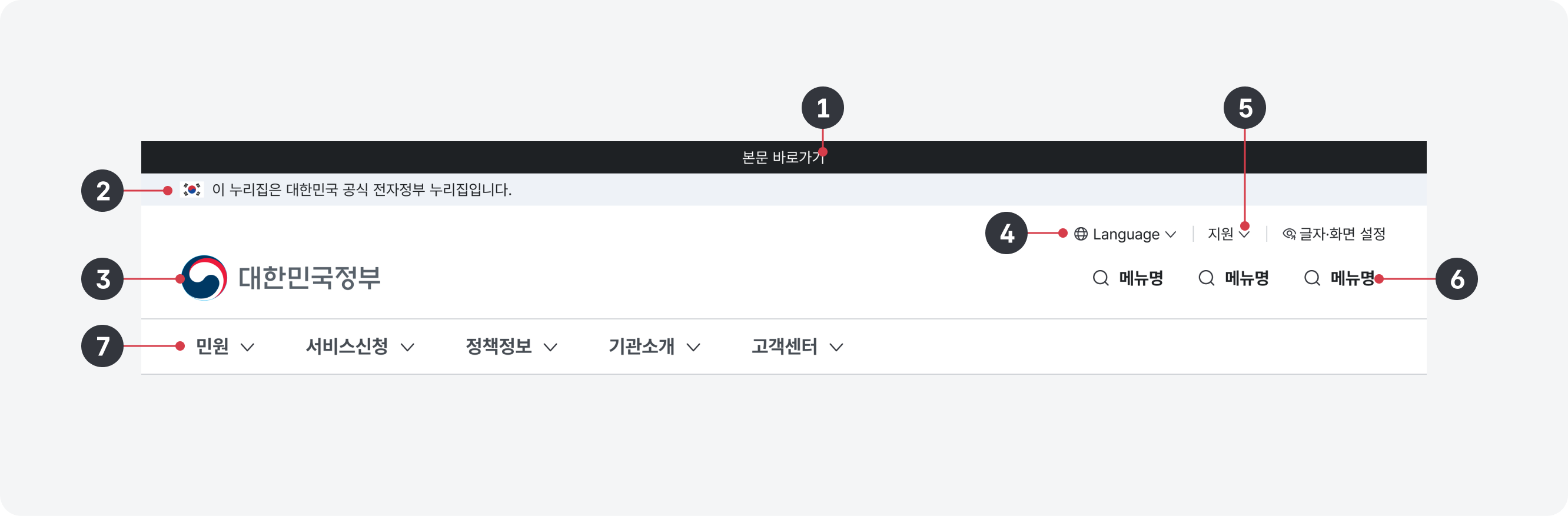 헤더의 일관성을 유지하는 것은 정부 브랜드 인지도와 사용자 신뢰를 구축하는 데 필수 - 정부 로고는 항상 헤더의 왼쪽 상단에 제공